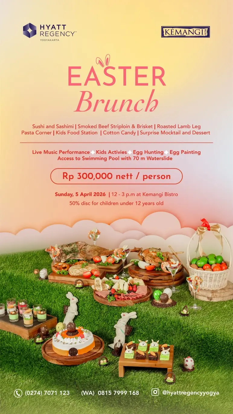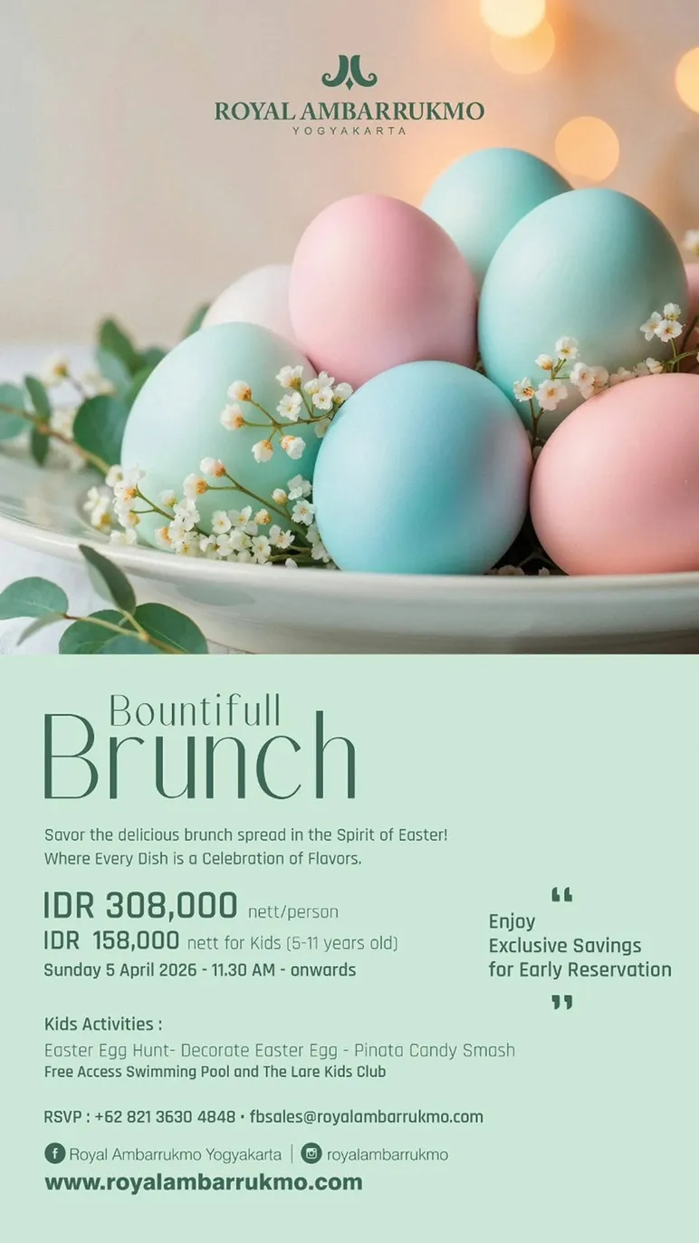 Grand Hotel De Djokja presents an Easter Brunch experience at Wiji Restaurant on Sunday, April 5, 2026. Buffet Brunch is offered at IDR 250,000 nett/pax, consisting of live music entertainment, swimming pool & kids club access, cupcake decoration for children, and a lucky draw with the main prize of staying in the Executive Suite. There is also a Buffet Brunch and 2 hours of free-flow beer offered at IDR 500,000 nett/person.