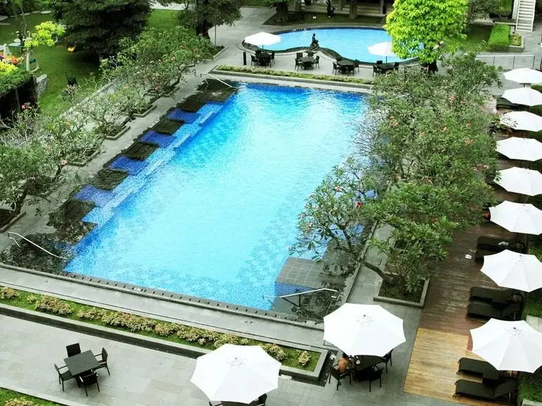 Hotel Tentrem Yogyakarta features a highly-regarded, tree-lined outdoor infinity pool that serves as the centerpiece of its lush courtyard and is lauded for its elegant, tranquil atmosphere. Divided into sections for both laps and casual swimming, this luxury pool area is complemented by surrounding sun loungers, a separate children's pool, a poolside bar, and is conveniently integrated with the hotel's full-service spa facilities, including a sauna and hot tub.