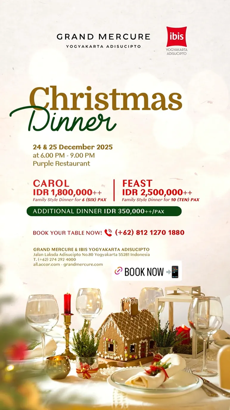 Grand Mercure and ibis are presenting Christmas Dinner on December 24-25, 2025, from 6 p.m. to 9 p.m. at Purple Restaurant. This package is available for IDR 1,800,000++ for the Carol package (6 people) and IDR 2,500,000++ for the Feast package (10 people), with additional IDR 350,000++ per person.