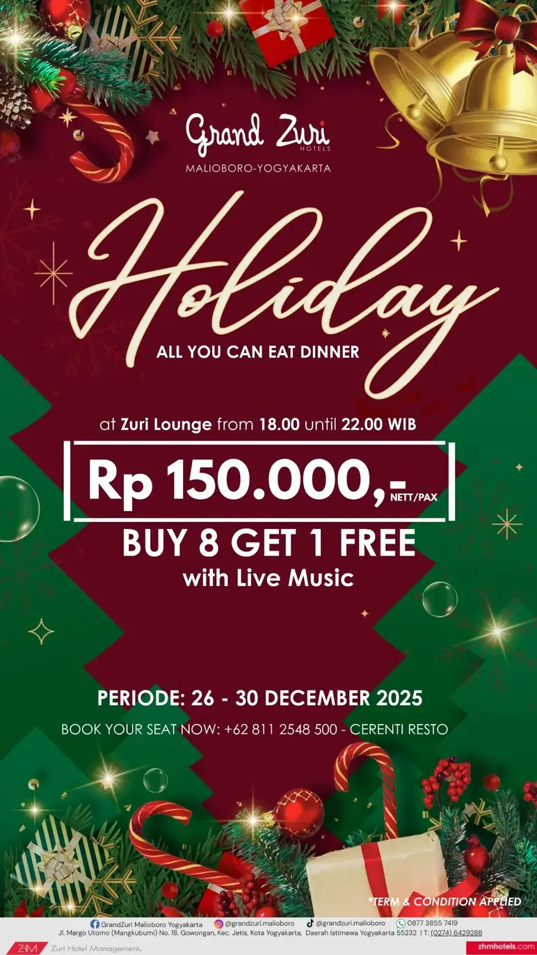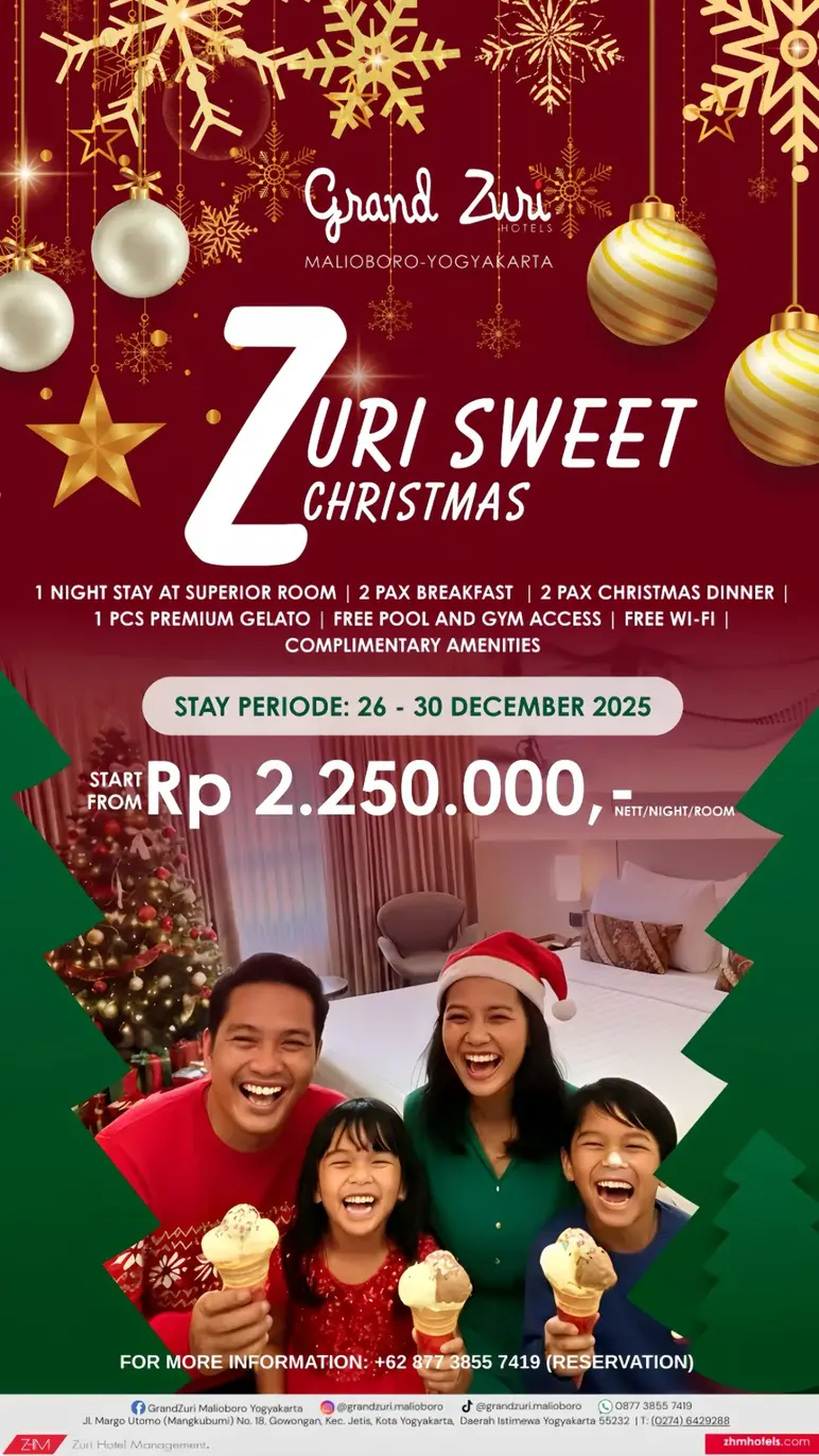 This Christmas, Grand Zuri is offering Zuri Sweet Christmas, starting from IDR 2,250,000, including a one-night stay in a Superior Room, breakfast for two, Christmas dinner for two, one premium gelato, free access to the swimming pool and gym, free Wi-Fi, and complimentary amenities. Guests are invited to enjoy Christmas with a stay at Grand Zuri between December 26-30, 2025.