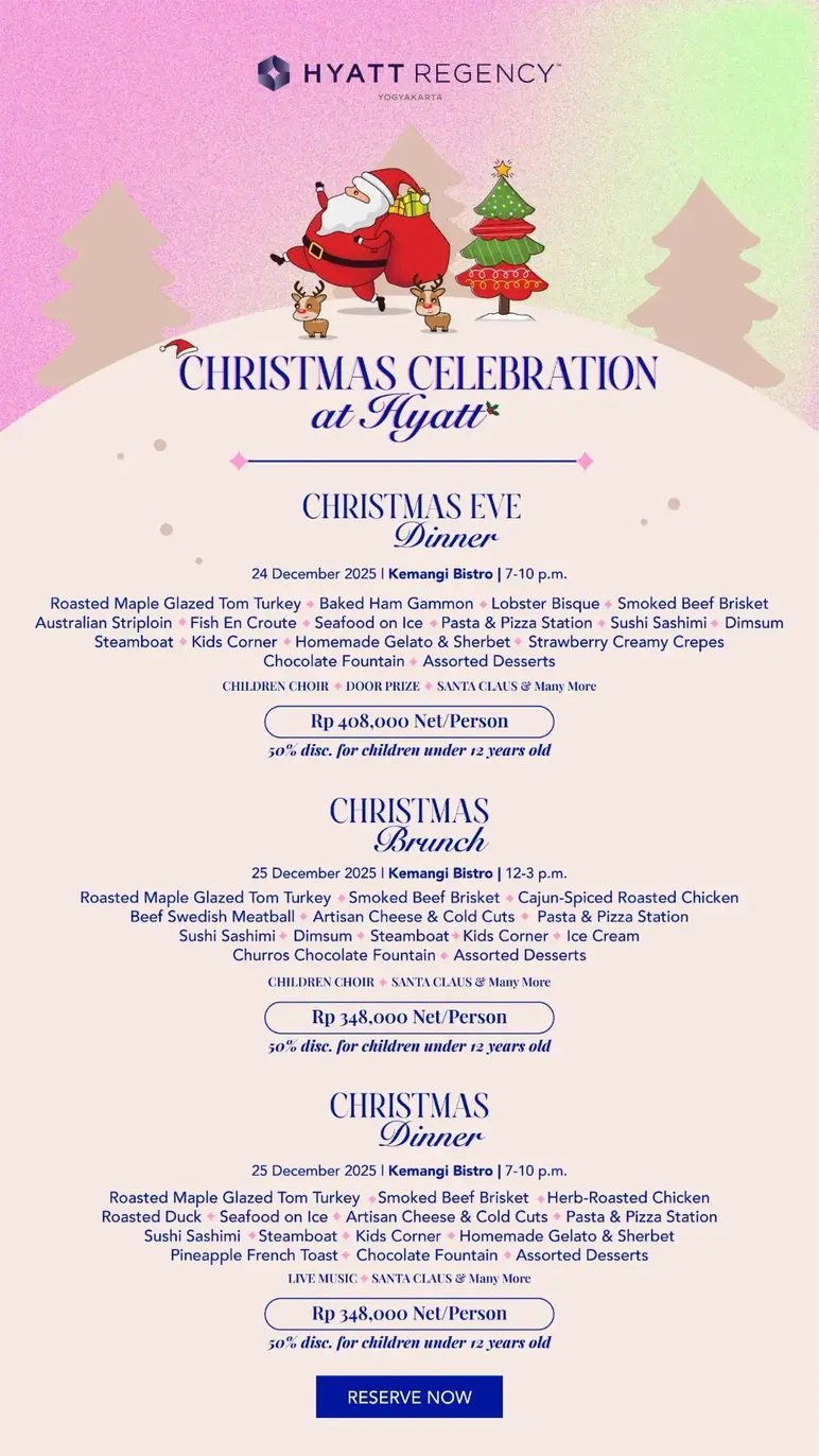 Hyatt Regency Yogyakarta celebrates Christmas with Christmas Eve Dinner, Christmas Brunch, and Christmas Dinner packages at Kemangi Bistro. Christmas Eve Dinner is available on December 24, 2025, from 7-10 PM at IDR 408,000 nett per person (50% discount for children under 12 years old). Christmas Brunch is on December 25, 2025, from 12 PM to 3 PM at IDR 348,000 nett per person (50% discount for children under 12 years old). Meanwhile, Christmas Dinner is on December 25, 2025, from 7-10 PM at IDR 348,000 nett per person (50% discount for children under 12 years old).