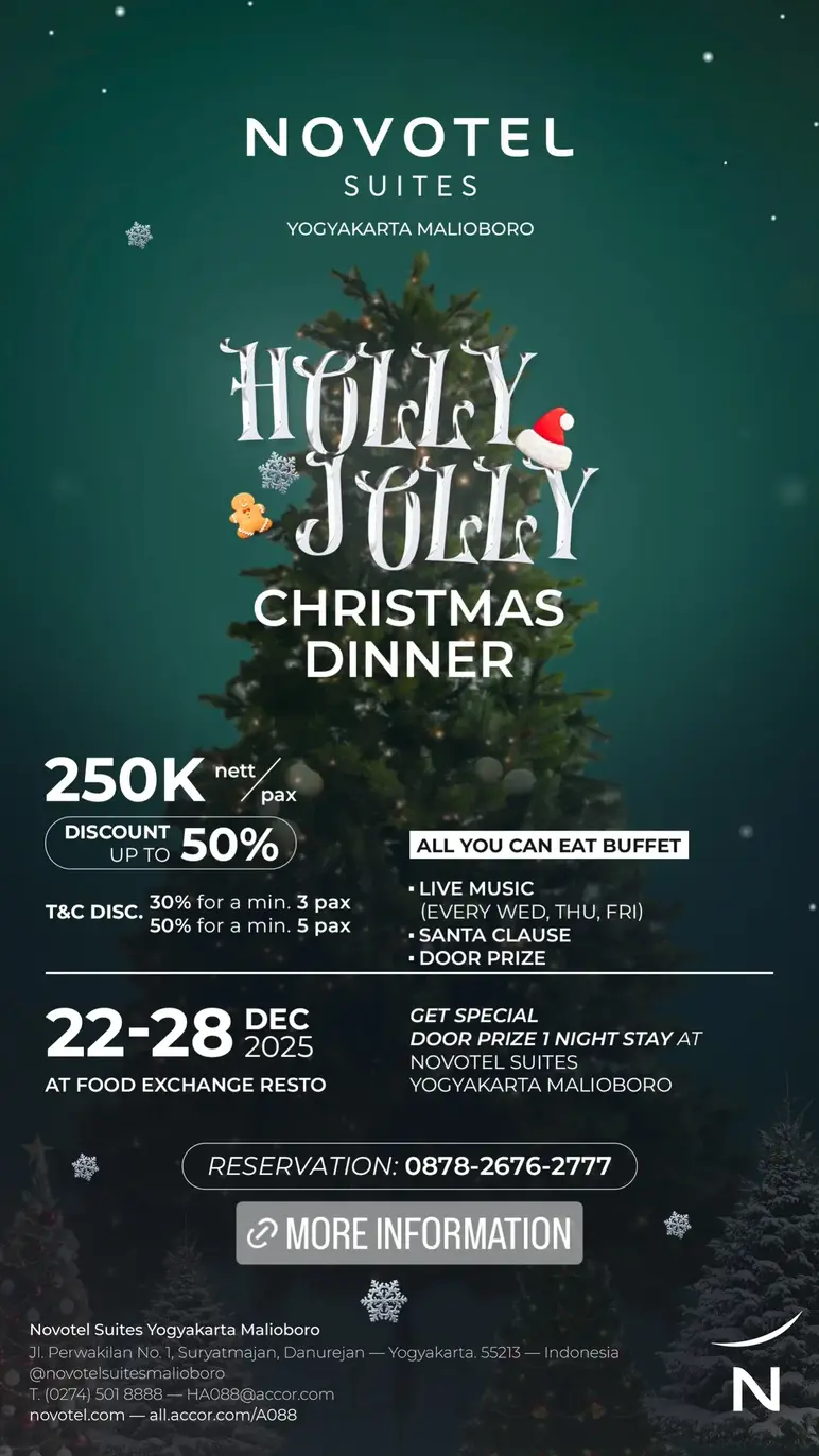 Novotel Suites presents the Holly Jolly Christmas Dinner, which can be enjoyed for IDR 250,000 nett per pax (30% discount for minimum orders of 3 pax and 50% discount for minimum orders of 5 pax). This dinner is presented with an All You Can Eat Buffet concept, live music on Wednesday, Thursday, Friday, Santa Claus, and a door prize of one night's stay at Novotel Suites. This package can be enjoyed from December 22-28, 2025, at Food Exchange Resto, Novotel Suites Yogyakarta Malioboro.