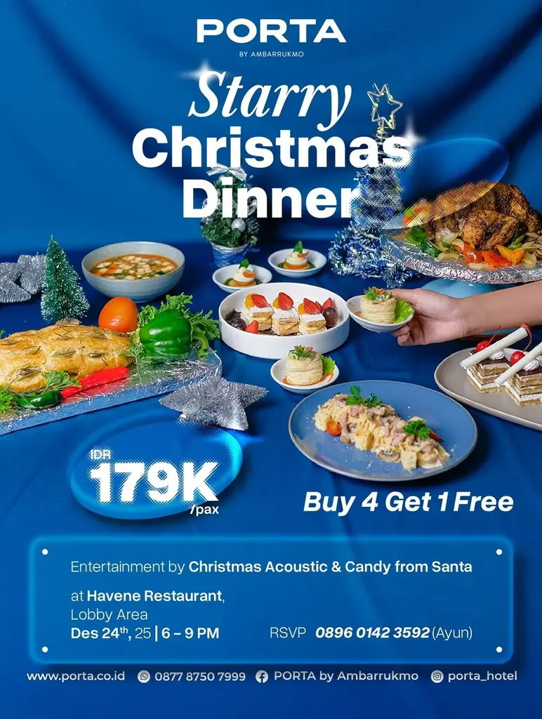 This year, Christmas Eve at PORTA by Ambarrukmo is celebrated with a festive dinner. Enjoy the warmth of the moment with your loved ones at Havene Restaurant on December 24, 2025, from 6 to 9 p.m., for IDR 179,000 per person. Get a special offer by buying 4 people and getting 1 free.