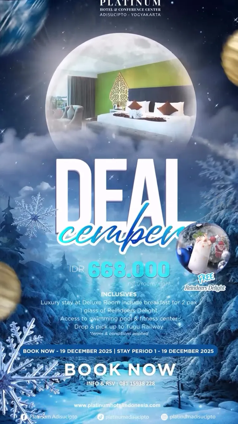 Platinum Adisucipto Hotel presents a Deal-Cember package at a price of IDR 668,000, including a stay in a Deluxe Room, breakfast for 2 pax, a glass of Reindeers Delight, access to the swimming pool and fitness center, and drop-off and pick-up to Tugu Station.