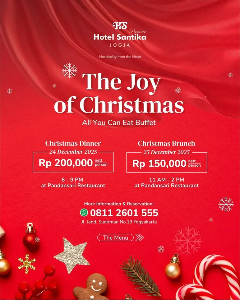 Hotel Santika presents a Christmas dinner package entitled "The Joy of Christmas." This All You Can Eat Buffet package is available for IDR 200,000 nett per person for Christmas Dinner on December 24, 2025, from 6 pm to 9 pm, while Christmas Brunch is presented on December 25, 2025, for IDR 150,000 nett per person, from 11 am to 2 pm at Pandansari Restaurant.