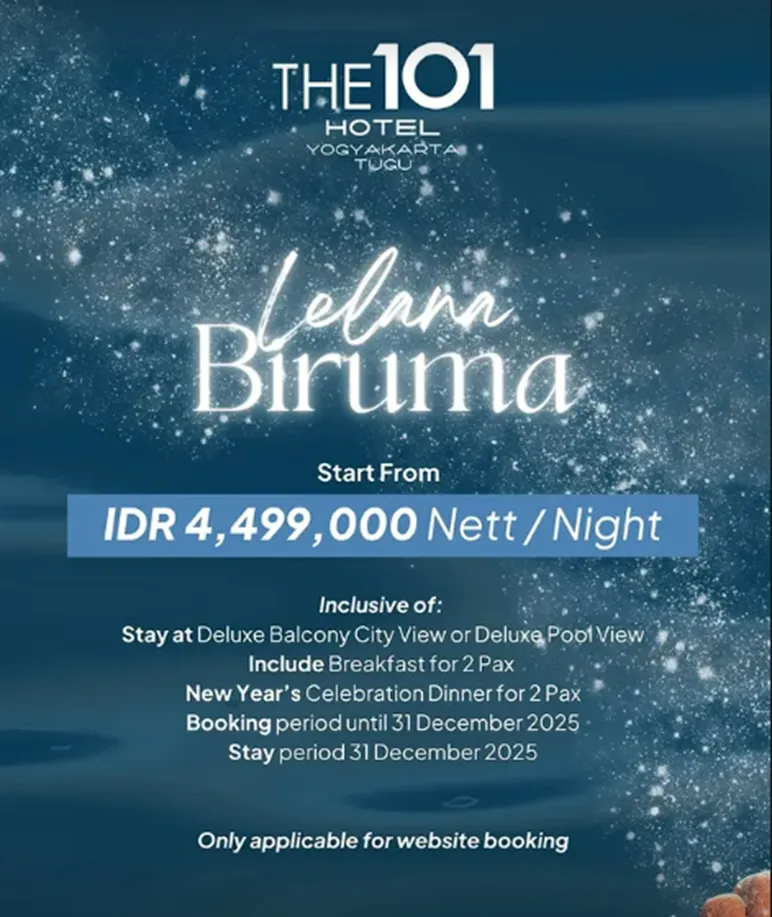 The 101 Yogyakarta Tugu celebrates Christmas with Lelana Biruma. Starting from IDR 4,499,000 nett per night, this package includes a stay at Deluxe Balcony City View or Deluxe Pool View, including breakfast for two, and a New Year's celebration dinner for two. Booking period until December 31, 2025, and stay period until December 31, 2025. This package is only applicable for website bookings.
