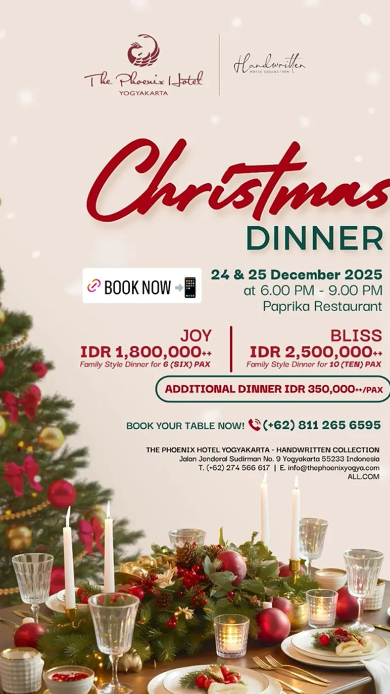 The Phoenix Hotel presents Christmas Dinner on December 24-25, 2025, from 6 to 9 p.m. at Paprika Restaurant. Guests are invited to enjoy dinner with their loved ones at IDR 1,800,000++ for 6 people and IDR 2,500,000++ for 10 people, with an additional IDR 350,000++ per person.
