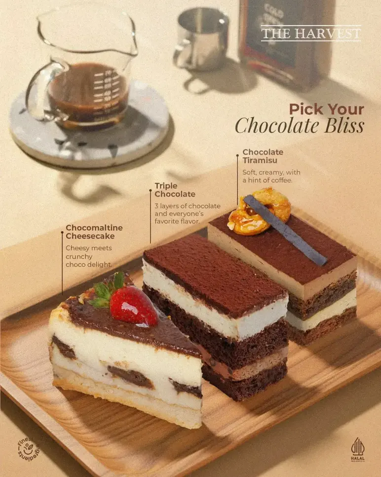 The Harvest is one of the most prominent and reliable Yogyakarta dessert shops, known as a high-end patisserie chain specializing in a wide, elegant array of cakes and chocolates for every occasion. It is famous for its classic, consistently delicious options, including the signature Chocolate de Ville and Strawberry Cheesecake.