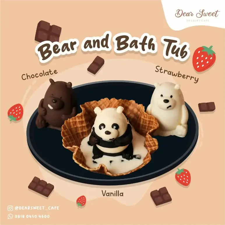 Dear Sweet Cafe & Cakery is a highly popular and instantly recognizable Yogyakarta dessert cafe celebrated for its unique and adorable Instagram-worthy animal-shaped desserts. This cozy spot offers creative treats like the viral Sleepy Dog Mousse (a chocolate mousse formed like a sleeping dog), the Bunny Panna Cotta, and the interactive Bear and Bath Up ice cream, which appeals strongly to a young audience.