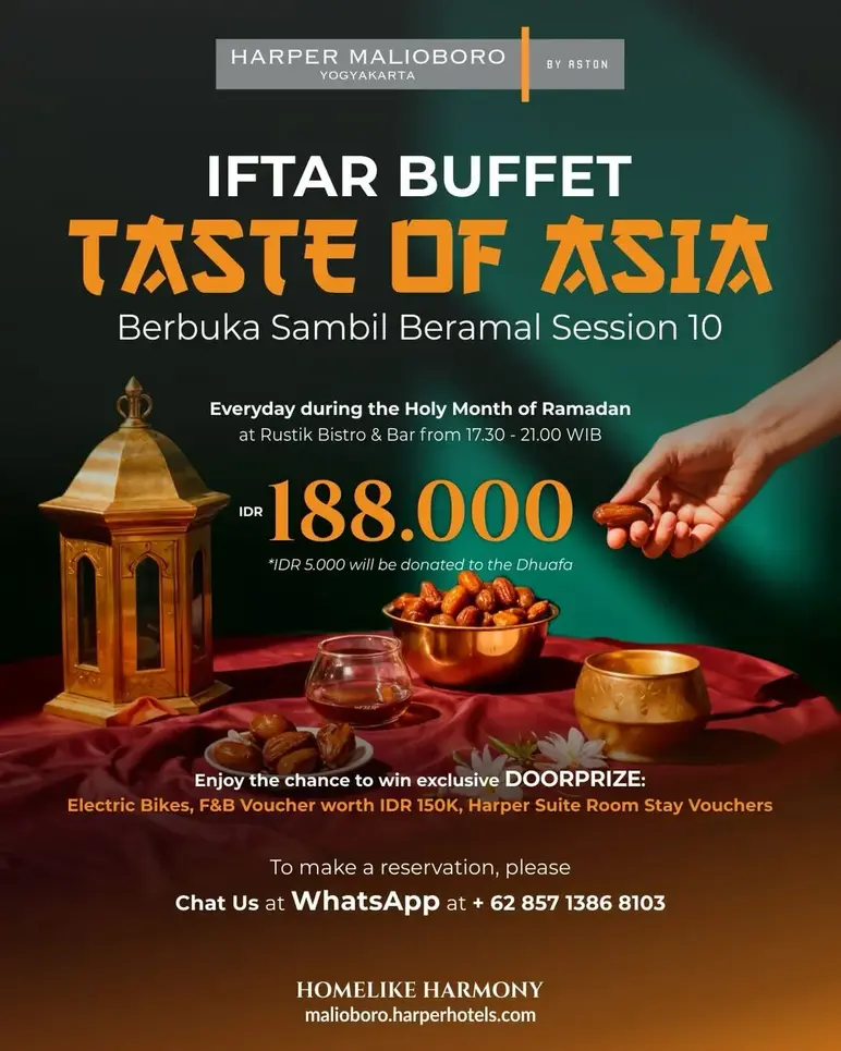 Harper Malioboro presents a Taste of Asia Iftar Buffet experience, available throughout Ramadan from 5:30 p.m. to 9 p.m. at Rustik Bistro & Bar, priced at IDR 188,000. Every IDR 5,000 from your purchase will be donated to the underprivileged.