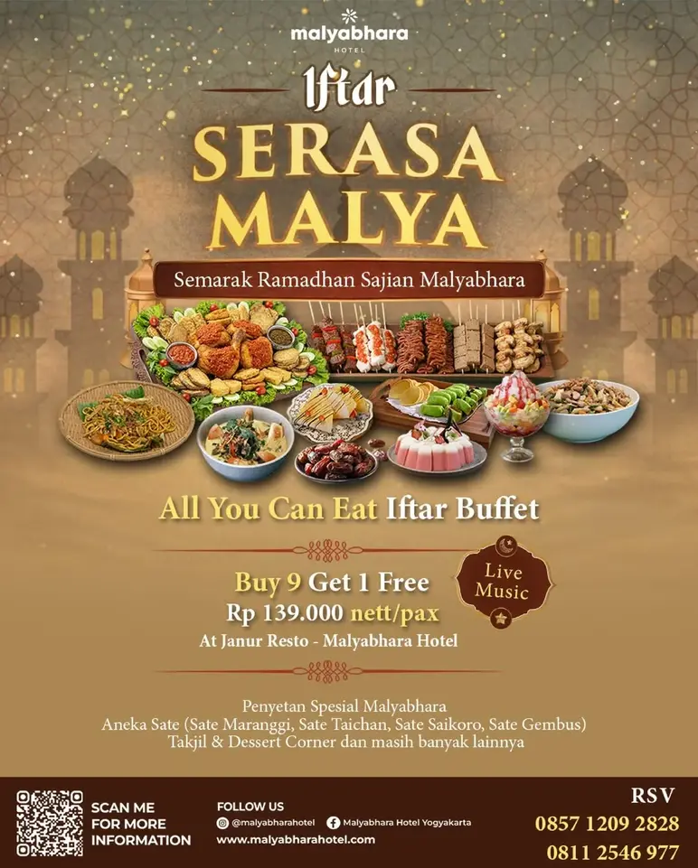 Malyabhara Hotel presents Iftar Serasa Malya, as an All-You-Can-Eat Iftar Buffet breaking the fast experience that can be obtained at a price of IDR 139,000 nett/pax, at Janur Resto.