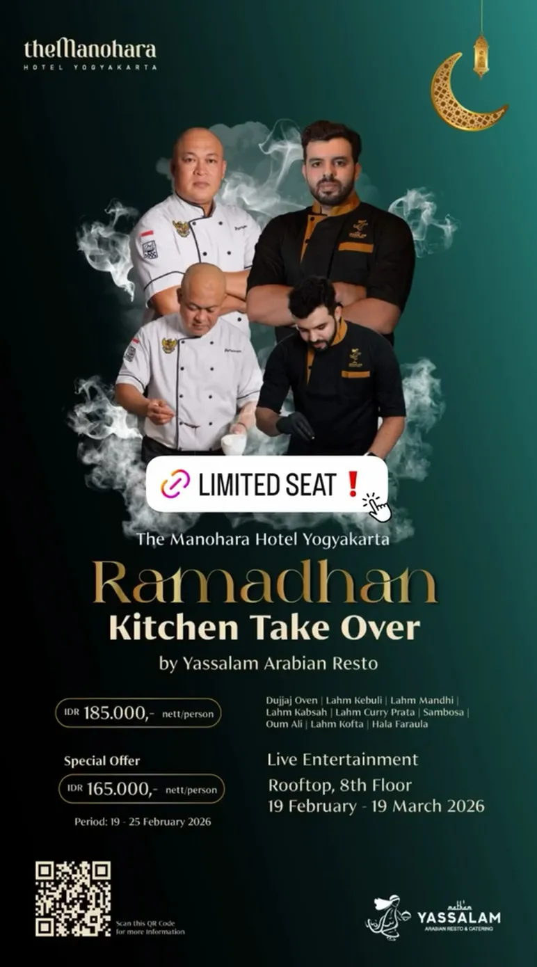 Manohara Hotel is offering a unique iftar experience this Ramadan with Ramadhan Kitchen Takeover by Yassalam Arabian Resto. Available from February 19 to March 19, 2026, for IDR 185,000 nett per person, at Rooftop, 8th Floor.