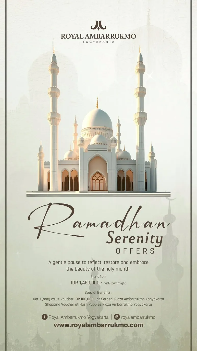 Royal Ambarrukmo offers a Ramadhan Serenity stay experience starting from IDR 1,450,000 nett/room/night. Guests can enjoy one IDR 100,000 value voucher at Seroeni Plaza Ambarrukmo Yogyakarta and a shopping voucher at Hush Puppies Plaza Ambarrukmo Yogyakarta.